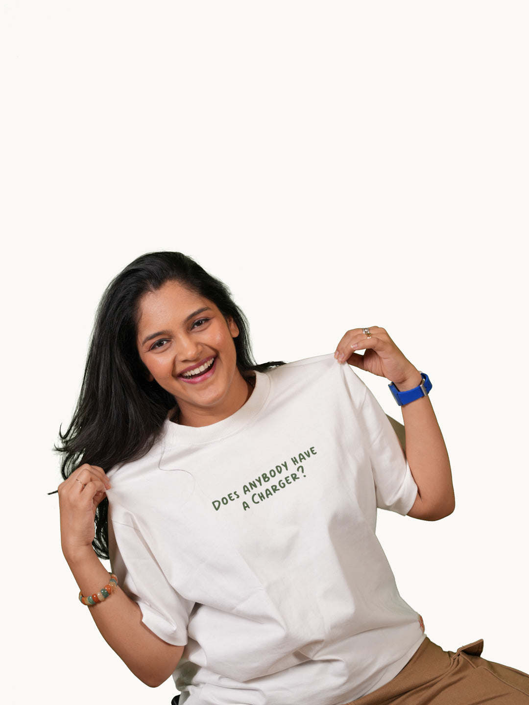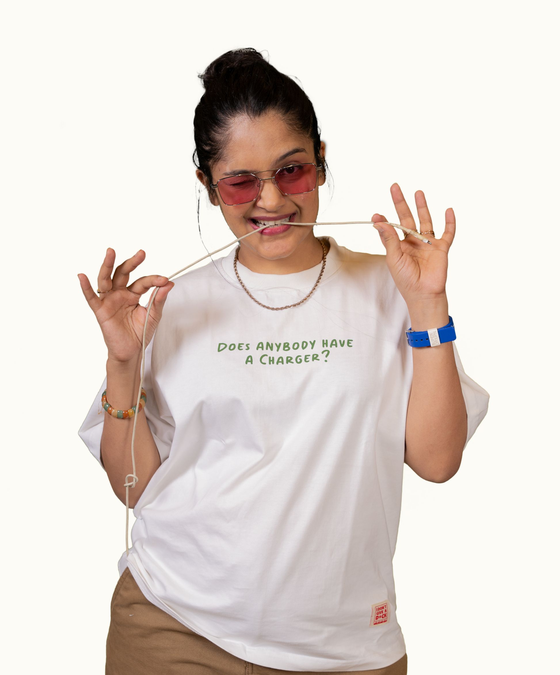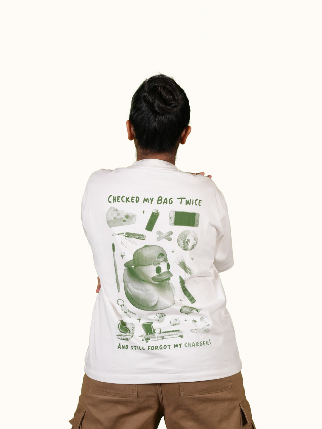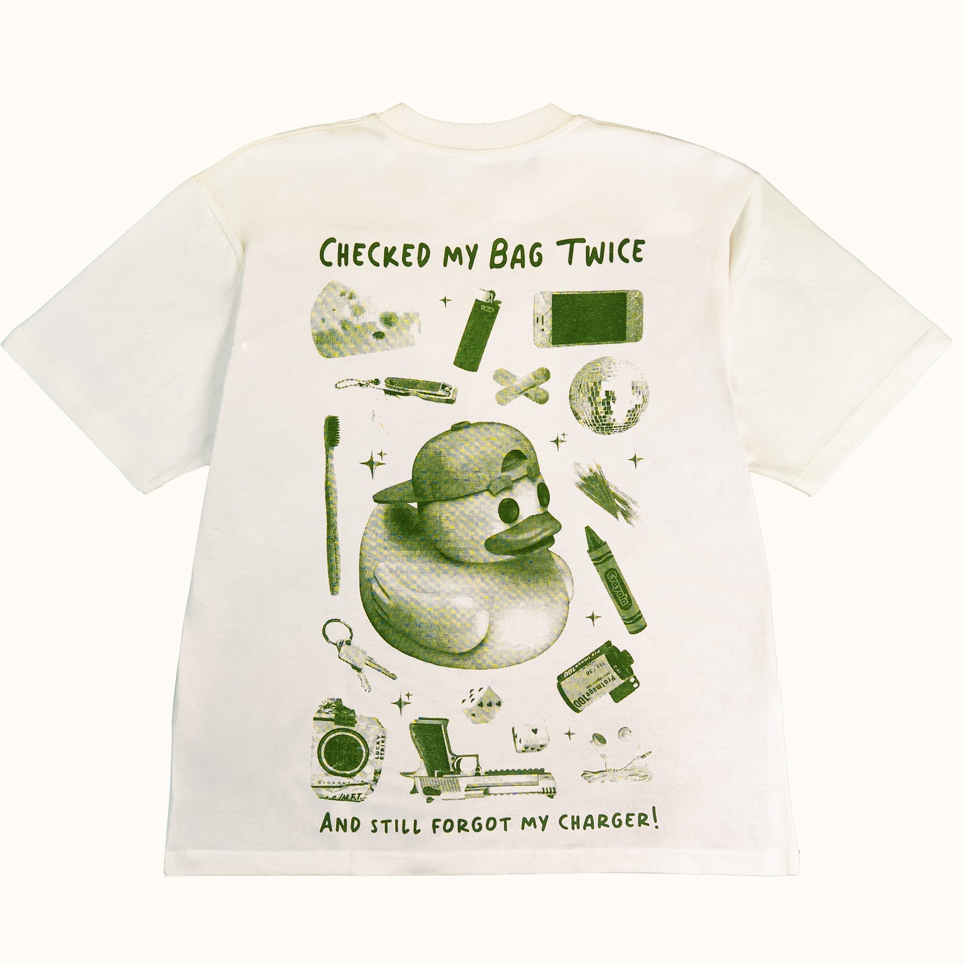 We’ve all been there — 3% battery, a hopeful glance around the room, and that one desperate question that never gets the right answer. This tee brings that struggle to life with a twist of satire: a design that shows the X-ray of a bag full of random stuff — a toy gun, crayons, band-aids, dreams... but no charger in sight.