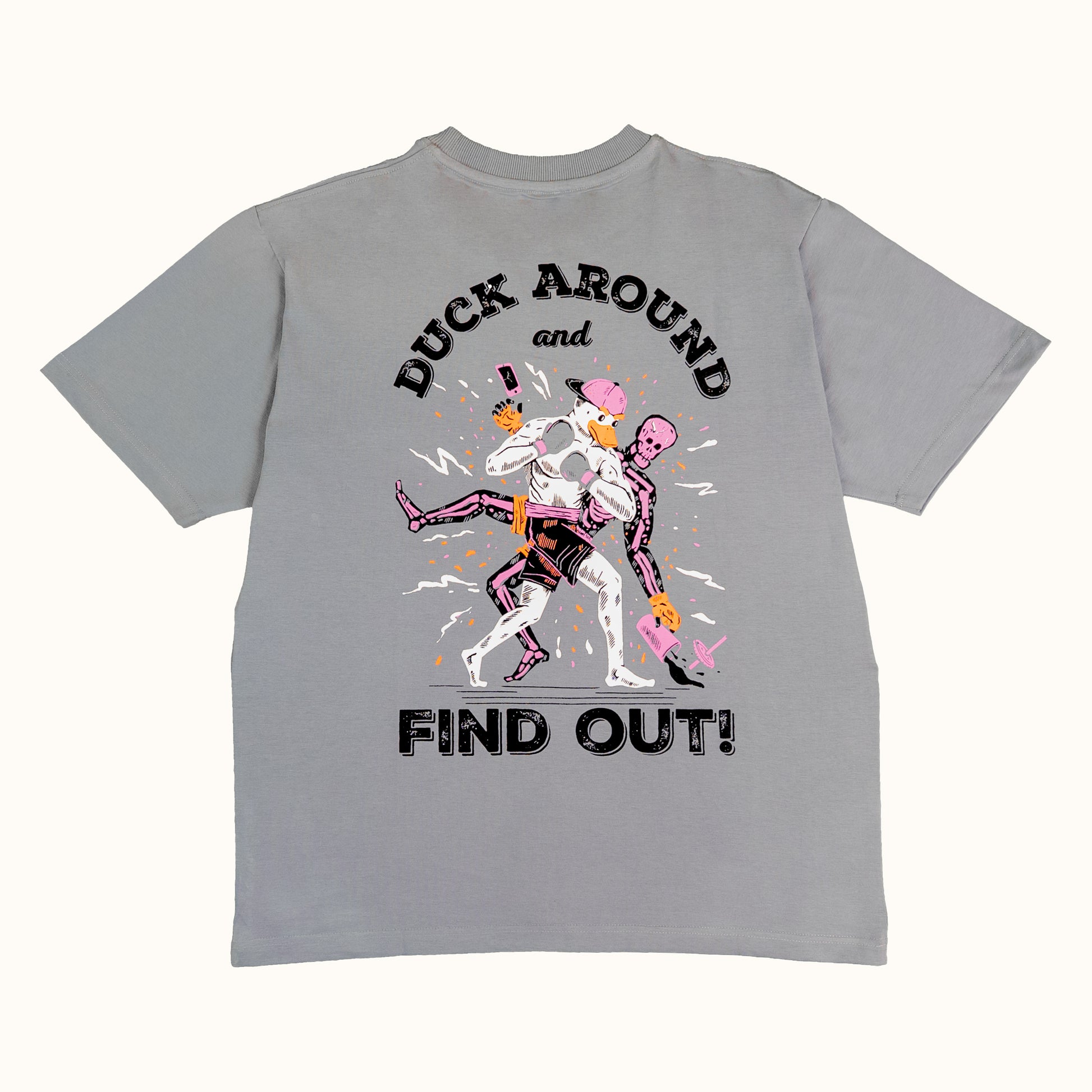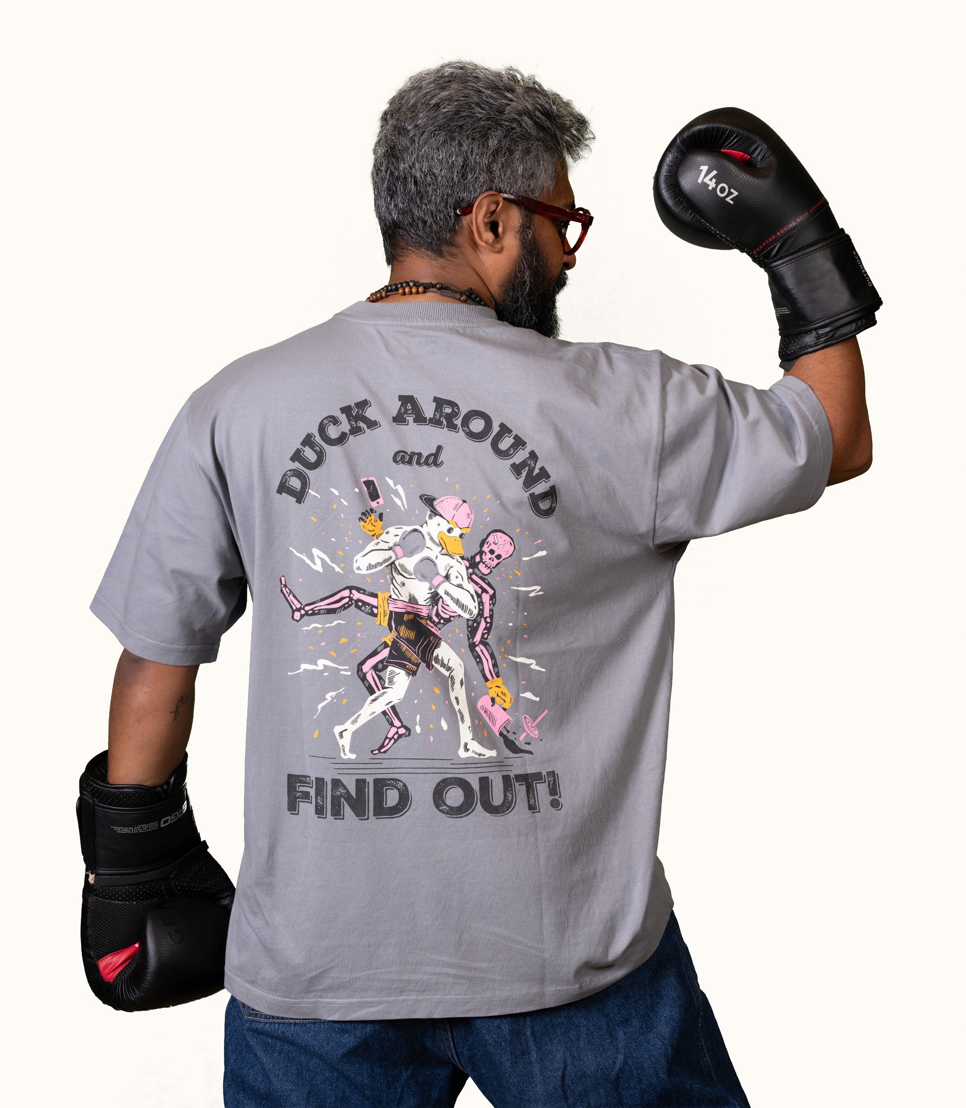 In this chaotic corner: a duck with boxing gloves. In the other? A skeleton that’s probably been living rent-free in your head for a while. This tee captures the everyday battle of mind vs. madness, fear vs. funk — or maybe it’s just a duck fighting a skeleton. Either way, it slaps.